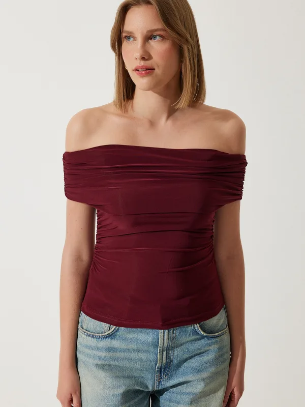 Blouse type: Blouseshirt; Design: Gevoerde zoom/rand, Rechte zoom, Strapless/off-shoulder; Materiaal: Jersey; Halstype: Carmen hals; Motief: Effen; Kraag: Zonder kraag; Details: Gedrapeerd; Extra's: Op staal naden, Voelt zacht aan; Pasvorm: Slanke pasvorm; Armlengte: Kwartmouw; Lengte: Normale lengte