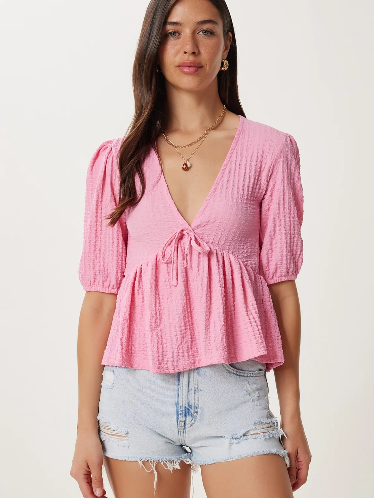 Blouse type: Blouseshirt; Design: Gevoerde zoom/rand, Pofmouwen, Diepe snit/decolleté; Motief: Effen; Kraag: Zonder kraag; Details: Gedrapeerd; Extra's: Applicaties, Op staal naden, Met textuur; Pasvorm: Normale pasvorm; Armlengte: Halve mouw; Lengte: Normale lengte