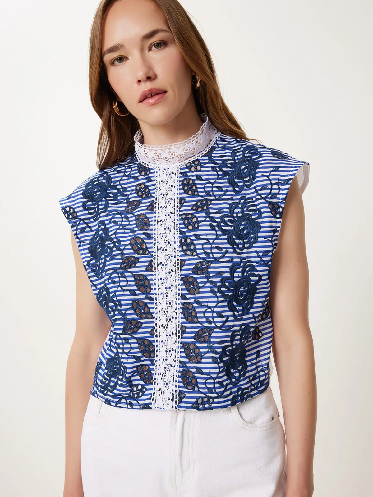 Blouse type: Blouseshirt; Design: Gevoerde zoom/rand, Gesneden mouw; Type sluiting: Knoopsluiting; Materiaal: Katoen; Motief: Bloemenprint; Kraag: Opstaande kraag; Details: Kant, Borduursels, Mesh; Extra's: Applicaties, Lichte stof; Pasvorm: Normale pasvorm; Armlengte: Kwartmouw; Lengte: Normale lengte