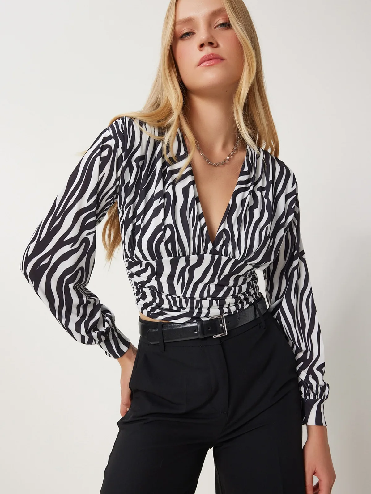 Blouse type: Klassieke blouse; Design: Gevoerde zoom/rand; Motief: Dierenprint; Details: Gedrapeerd; Extra's: All-over patroon, Voelt zacht aan; Pasvorm: Normale pasvorm; Armlengte: Lange mouw; Lengte: Korte pasvorm