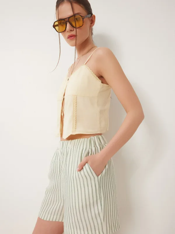 Design: Elastische taille/zoom, Zakken aan de zijkant; Materiaal: Katoen; Motief: Gestreept; Details: Gedrapeerd; Extra's: All-over patroon, Voelt zacht aan; Lengte: Kort/mini; Pasvorm: Regular; Taillehoogte: High waist
