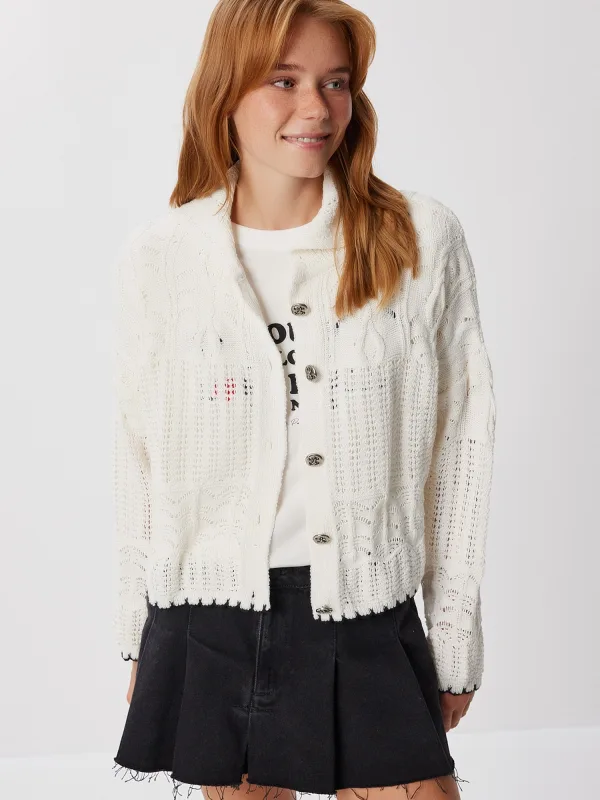 Design: Knop placket, Turn-down kraag; Type sluiting: Knoopsluiting; Materiaal: Knitwear; Motief: Effen; Details: Mesh; Extra's: Fully fashioned, Voelt zacht aan; Pasvorm: Losse pasvorm; Armlengte: Lange mouw; Lengte: Normale lengte