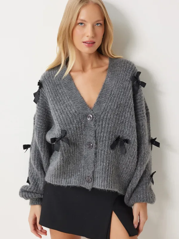 Design: Pofmouwen, Diepe snit/decolleté, Overcut schouder; Type sluiting: Knoopsluiting; Materiaal: Knitwear; Halstype: V-hals; Motief: Effen; Extra's: Applicaties, Met textuur; Pasvorm: Losse pasvorm; Armlengte: Lange mouw; Lengte: Normale lengte
