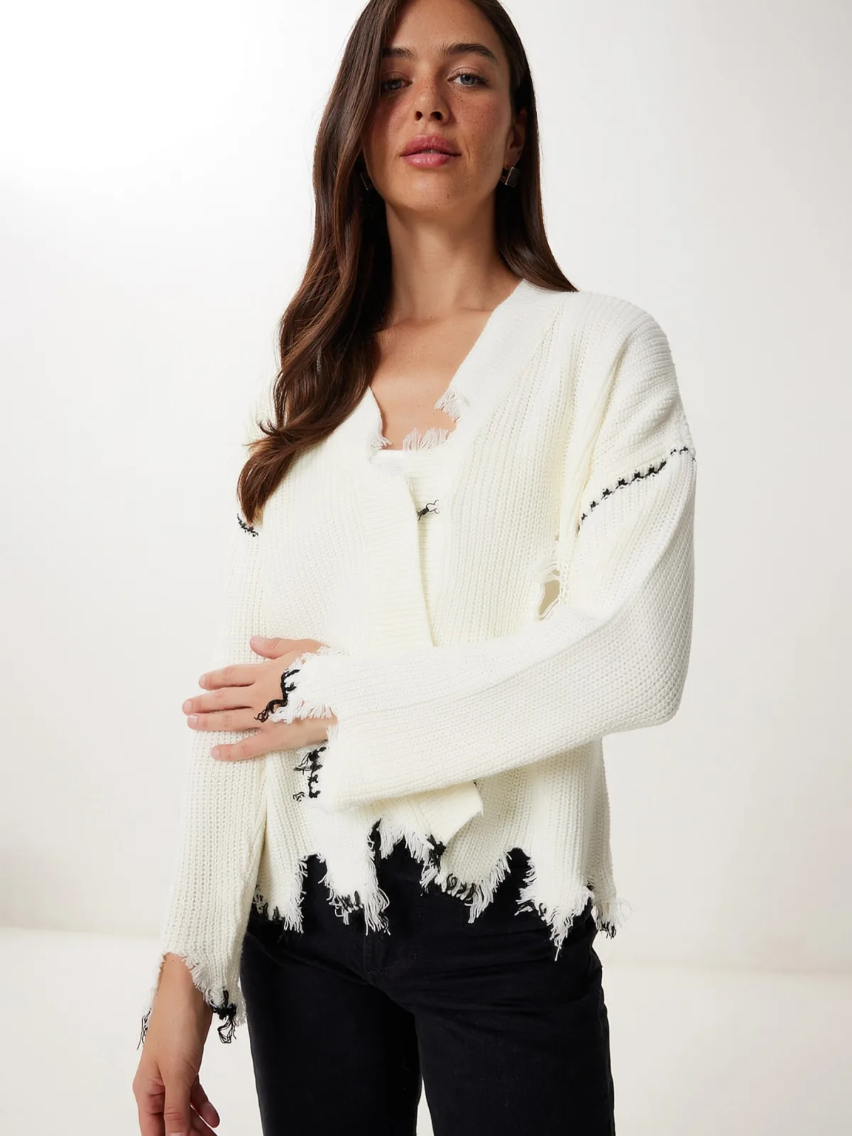 Design: Geribbelde kraag, Gefranjerde zoom, Overcut schouder; Type sluiting: Haakjes; Materiaal: Knitwear; Halstype: V-hals; Motief: Effen; Details: Franjes; Extra's: Met textuur; Pasvorm: Normale pasvorm; Armlengte: Lange mouw; Lengte: Normale lengte