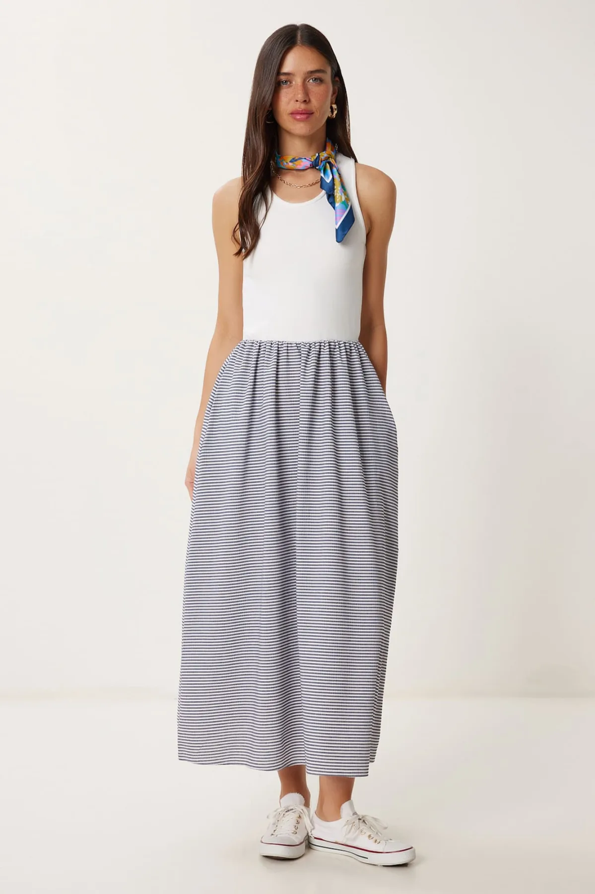 Design: Gevoerde zoom/rand, Rechte zoom, Zakken aan de zijkant; Halstype: Ronde hals; Motief: Gestreept; Soort bandjes: Brede bandjes; Details: Gedrapeerd; Extra's: All-over patroon, Gladde stof; Lengte: 7/8 lengte; Snit: Getailleerd; Pasvorm: Normale pasvorm; Armlengte: Mouwloos