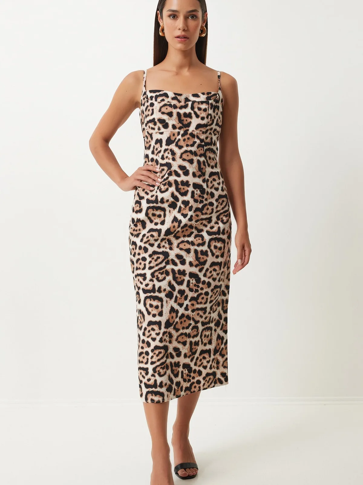 Design: Gevoerde zoom/rand, Rug rits, Rug inkeep, Om te knopen/binden; Type sluiting: Ritssluiting; Halstype: Carréhals; Motief: Dierenprint; Soort bandjes: Spaghettibandjes; Details: Cut-outs; Extra's: All-over patroon, Voelt zacht aan; Lengte: 3/4 lengte; Snit: Getailleerd; Pasvorm: Slanke pasvorm; Armlengte: Mouwloos
