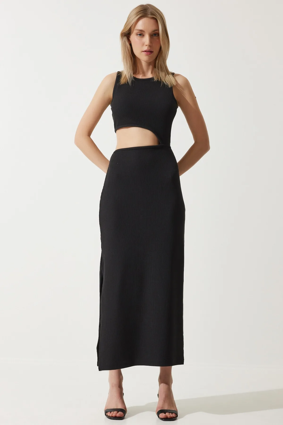 Design: Gevoerde zoom/rand, Split, Rechte zoom; Halstype: Ronde hals; Motief: Effen; Soort bandjes: Brede bandjes; Details: Cut-outs; Extra's: Op staal naden, Gladde stof; Lengte: 7/8 lengte; Snit: Getailleerd; Pasvorm: Normale pasvorm; Armlengte: Mouwloos