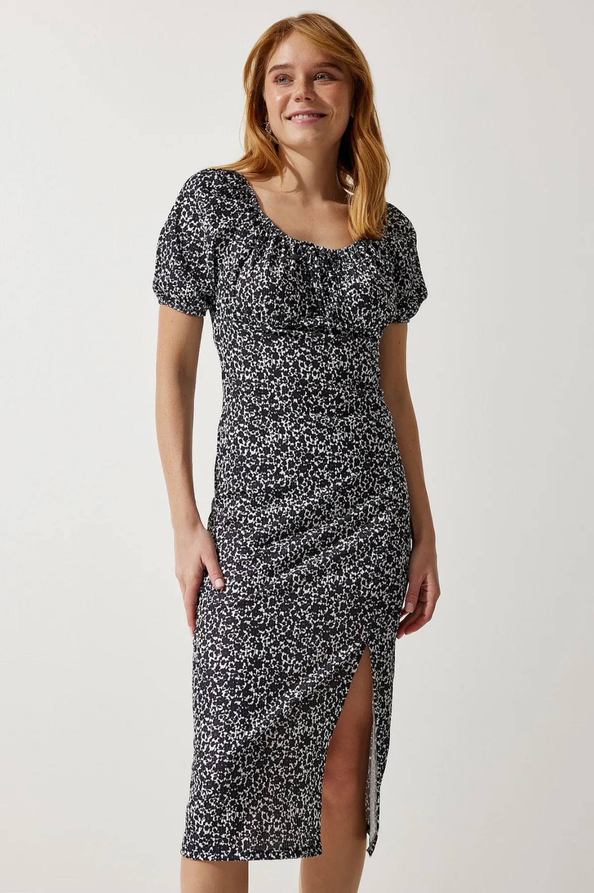 Design: Beenopening, Pofmouwen, Strapless/off-shoulder, Om te knopen/binden; Materiaal: Viscose; Halstype: Carmen hals; Motief: Bloemenprint; Details: Gedrapeerd; Extra's: All-over patroon, Koele grip, Draagbaar op 2 manieren; Lengte: 3/4 lengte; Snit: Recht; Pasvorm: Slanke pasvorm; Armlengte: Kwartmouw