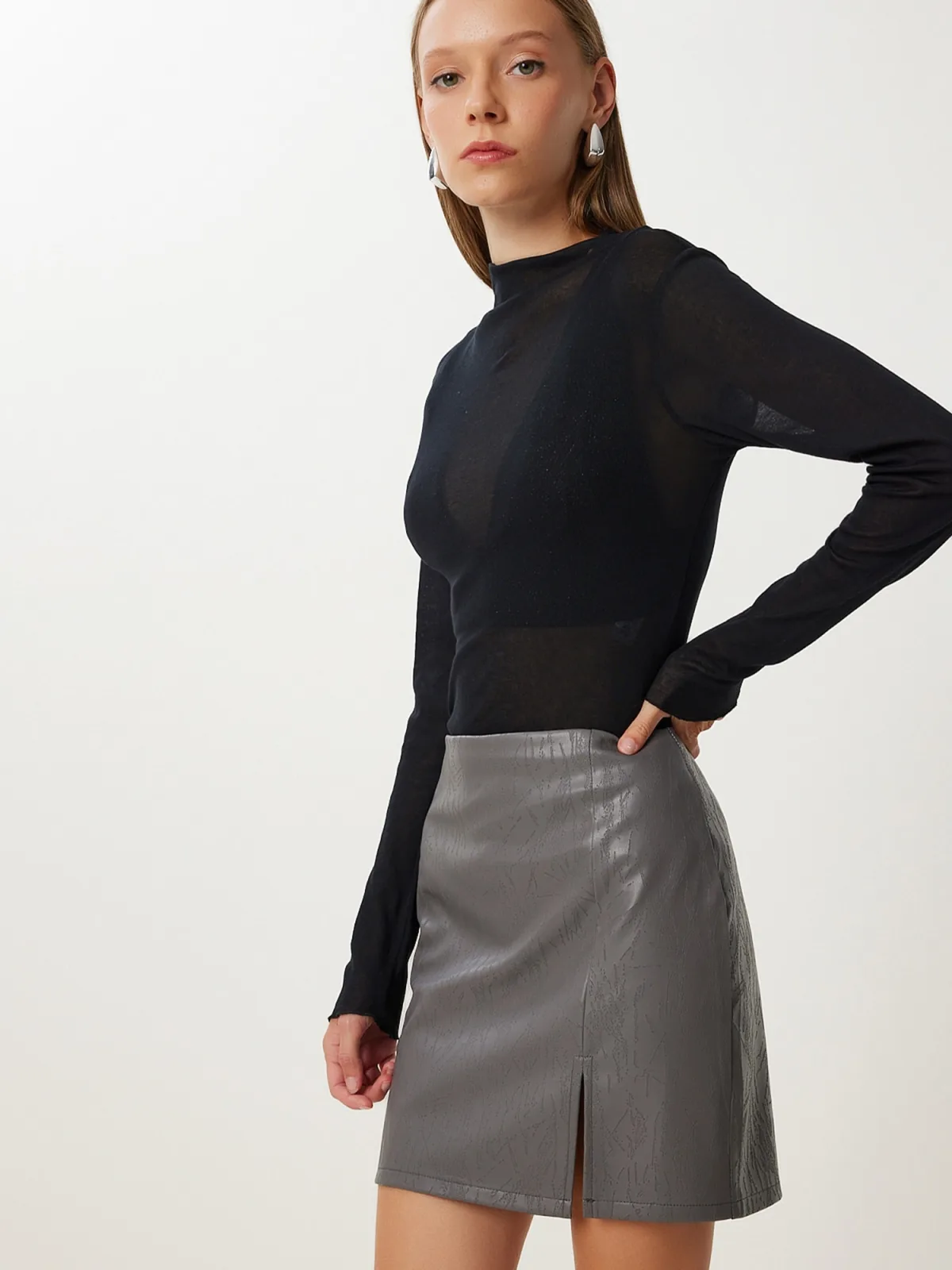 Design: Split, Rechte zoom, Rug rits; Type sluiting: Ritssluiting; Materiaal: Imitatieleder; Motief: Effen; Rokvorm: Kokerrok; Extra's: Op staal naden; Lengte: Kort/mini; Pasvorm: Normale pasvorm; Taillehoogte: High waist