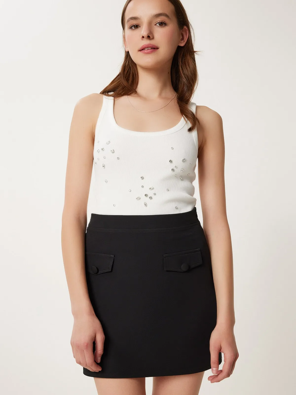 Design: Nepzakken, Ritszakken aan de zijkant; Type sluiting: Ritssluiting; Motief: Effen; Rokvorm: Minirok; Extra's: Op staal naden, Gladde stof; Lengte: Kort/mini; Pasvorm: Normale pasvorm; Taillehoogte: High waist