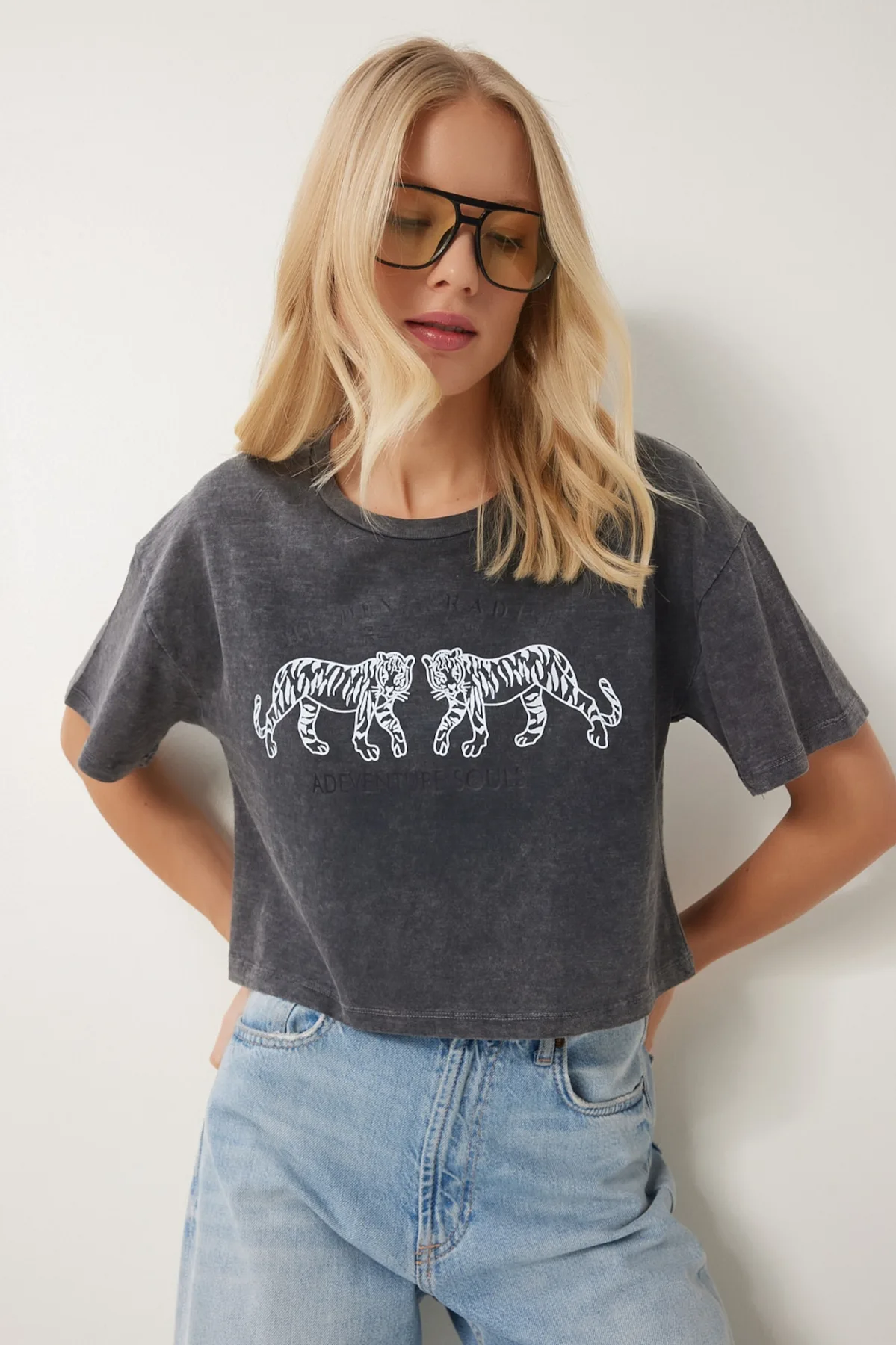 Design: Gevoerde zoom/rand, Geribbelde kraag, Rechte zoom, Overcut schouder, Nektape; Materiaal: Jersey; Halstype: Ronde hals; Motief: Motiefprint; Extra's: Op staal naden, Gewassen effect, Voelt zacht aan; Pasvorm: Normale pasvorm; Armlengte: Halve mouw; Lengte: Korte pasvorm