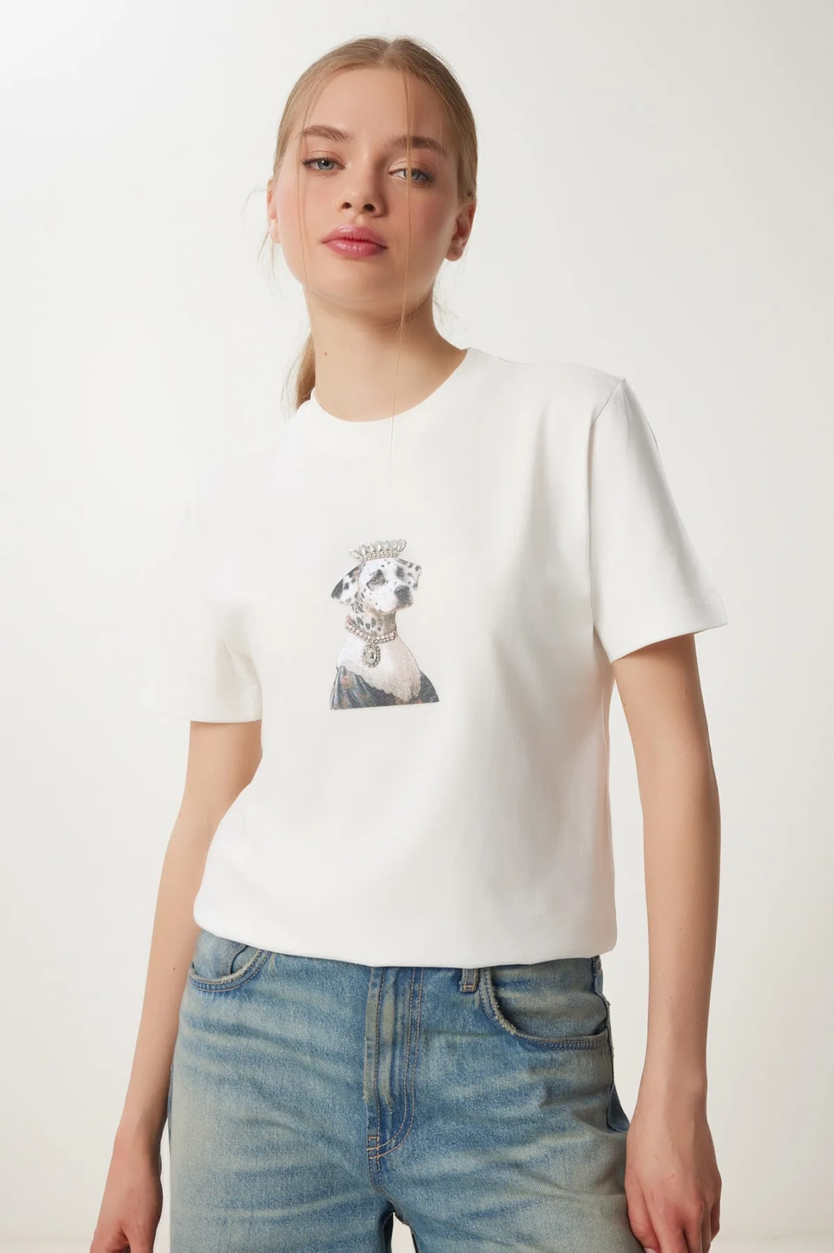 Design: Gevoerde zoom/rand, Geribbelde kraag, Rechte zoom; Materiaal: Jersey; Halstype: Ronde hals; Motief: Motiefprint; Details: Sierstenen; Extra's: Op staal naden, Voelt zacht aan; Pasvorm: Normale pasvorm; Armlengte: Kwartmouw; Lengte: Normale lengte