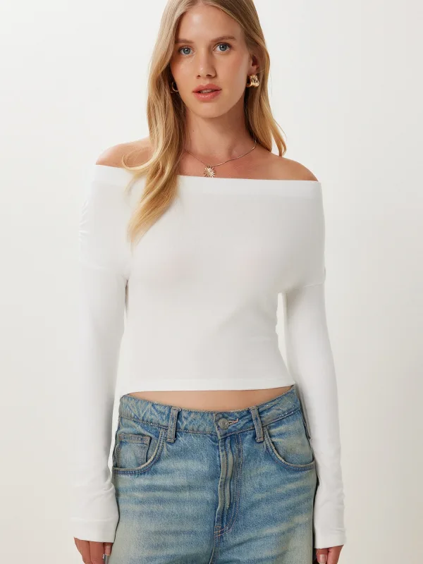 Design: Rechte zoom, Geribbeld gebreid, Strapless/off-shoulder; Materiaal: Jersey; Halstype: Carmen hals; Motief: Effen; Extra's: Op staal naden, Voelt zacht aan; Pasvorm: Slanke pasvorm; Armlengte: Lange mouw; Lengte: Korte pasvorm