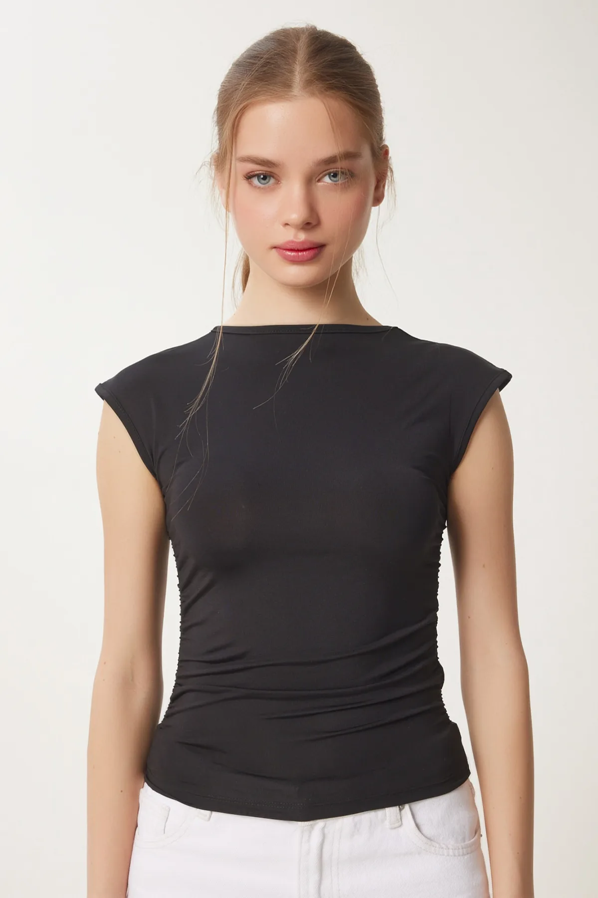 Design: Gevoerde zoom/rand, Gesneden mouw, Rechte zoom, Ingelegde kraag; Materiaal: Jersey; Halstype: Ronde hals; Motief: Effen; Soort bandjes: Brede bandjes; Details: Gedrapeerd; Extra's: Op staal naden, Voelt zacht aan; Pasvorm: Slanke pasvorm; Armlengte: Kwartmouw; Lengte: Normale lengte
