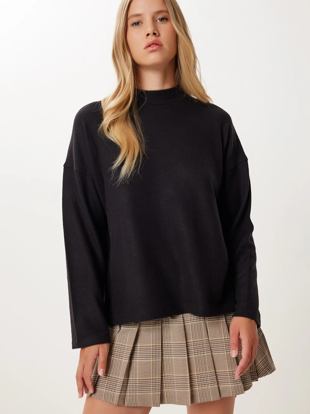 Design: Gevoerde zoom/rand, Rechte zoom, Overcut schouder; Halstype: Opstaande kraag; Motief: Effen; Extra's: Met textuur, Voelt zacht aan; Pasvorm: Losse pasvorm; Armlengte: Lange mouw; Lengte: Normale lengte