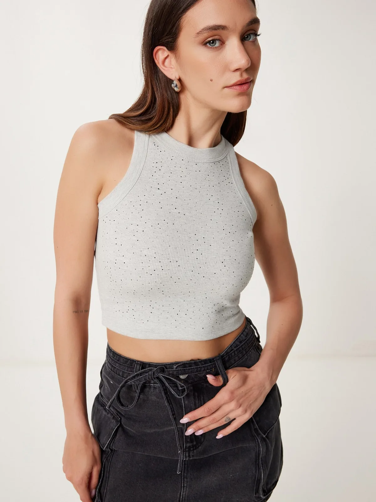 Design: Gevoerde zoom/rand, Geribbelde kraag, Rechte zoom, Geribbeld gebreid; Materiaal: Jersey; Halstype: Ronde hals; Soort bandjes: Brede bandjes; Details: Sierstenen; Extra's: Op staal naden, Voelt zacht aan; Pasvorm: Aansluitende pasvorm; Armlengte: Mouwloos; Lengte: Korte pasvorm