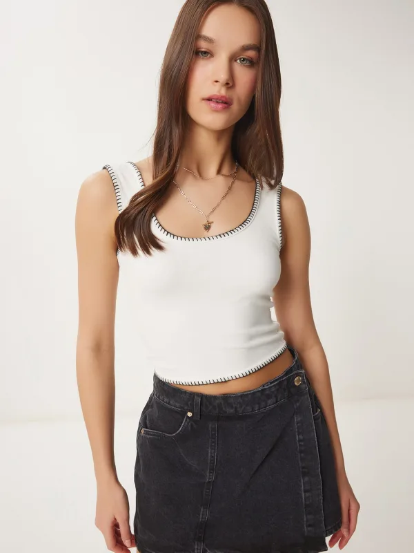Design: Rechte zoom, Siernaad; Materiaal: Jersey; Halstype: Ronde hals; Motief: Effen; Soort bandjes: Normale bandjes; Extra's: Op staal naden, Voelt zacht aan; Pasvorm: Slanke pasvorm; Armlengte: Mouwloos; Lengte: Korte pasvorm