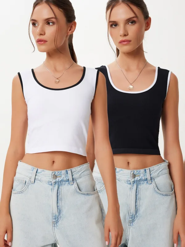 Design: Gevoerde zoom/rand, Rechte zoom, Ingelegde kraag; Materiaal: Jersey; Halstype: Ronde hals; Motief: Effen; Soort bandjes: Brede bandjes; Details: Backless; Extra's: Op staal naden, Voelt zacht aan; Pasvorm: Slanke pasvorm; Aantal: 2 Pack; Armlengte: Mouwloos; Lengte: Korte pasvorm