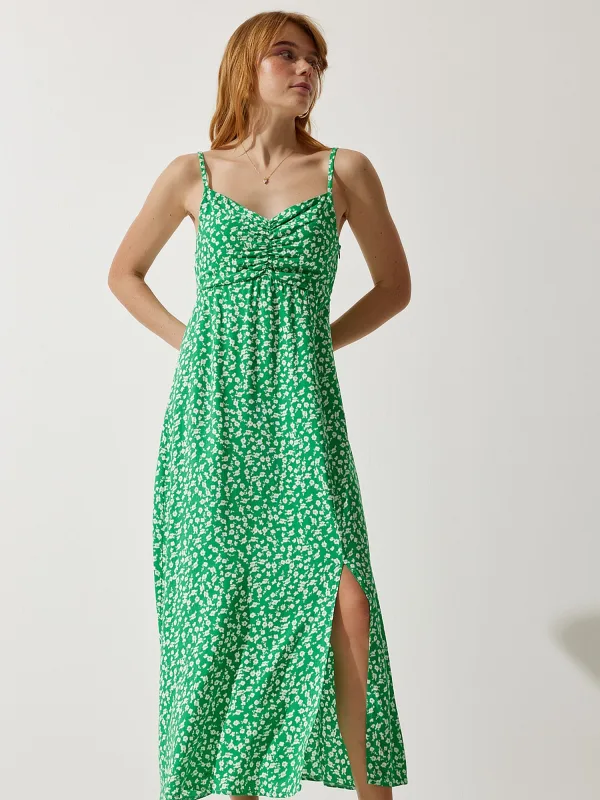 Design: Gevoerde zoom/rand, Beenopening, Diepe snit/decolleté, Elastische inzetstukken; Materiaal: Viscose; Halstype: V-hals; Motief: Bloemenprint; Soort bandjes: Spaghettibandjes; Details: Gedrapeerd; Extra's: Verstelbare bandjes, All-over patroon, Gladde stof; Lengte: 3/4 lengte; Snit: Uitlopend; Pasvorm: Normale pasvorm; Armlengte: Mouwloos