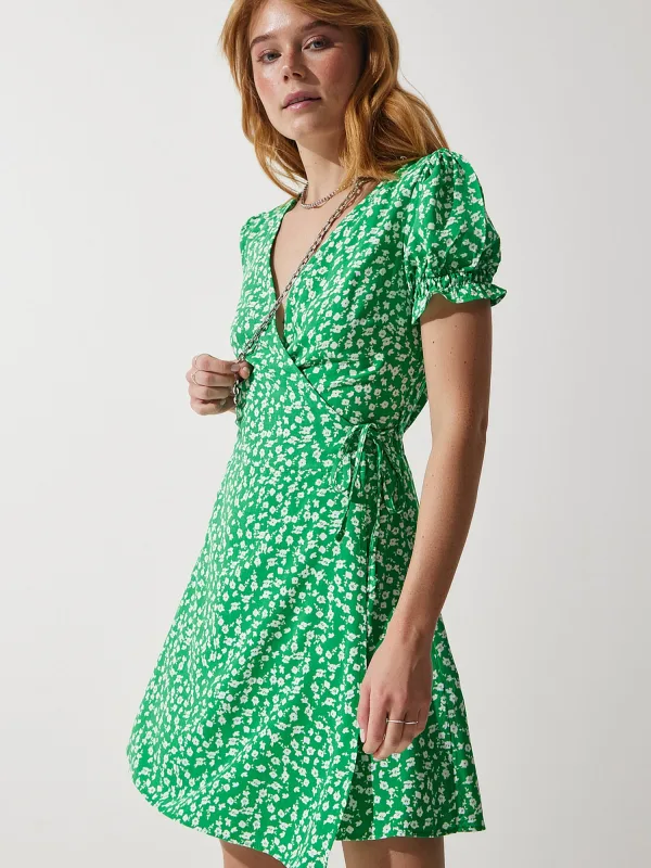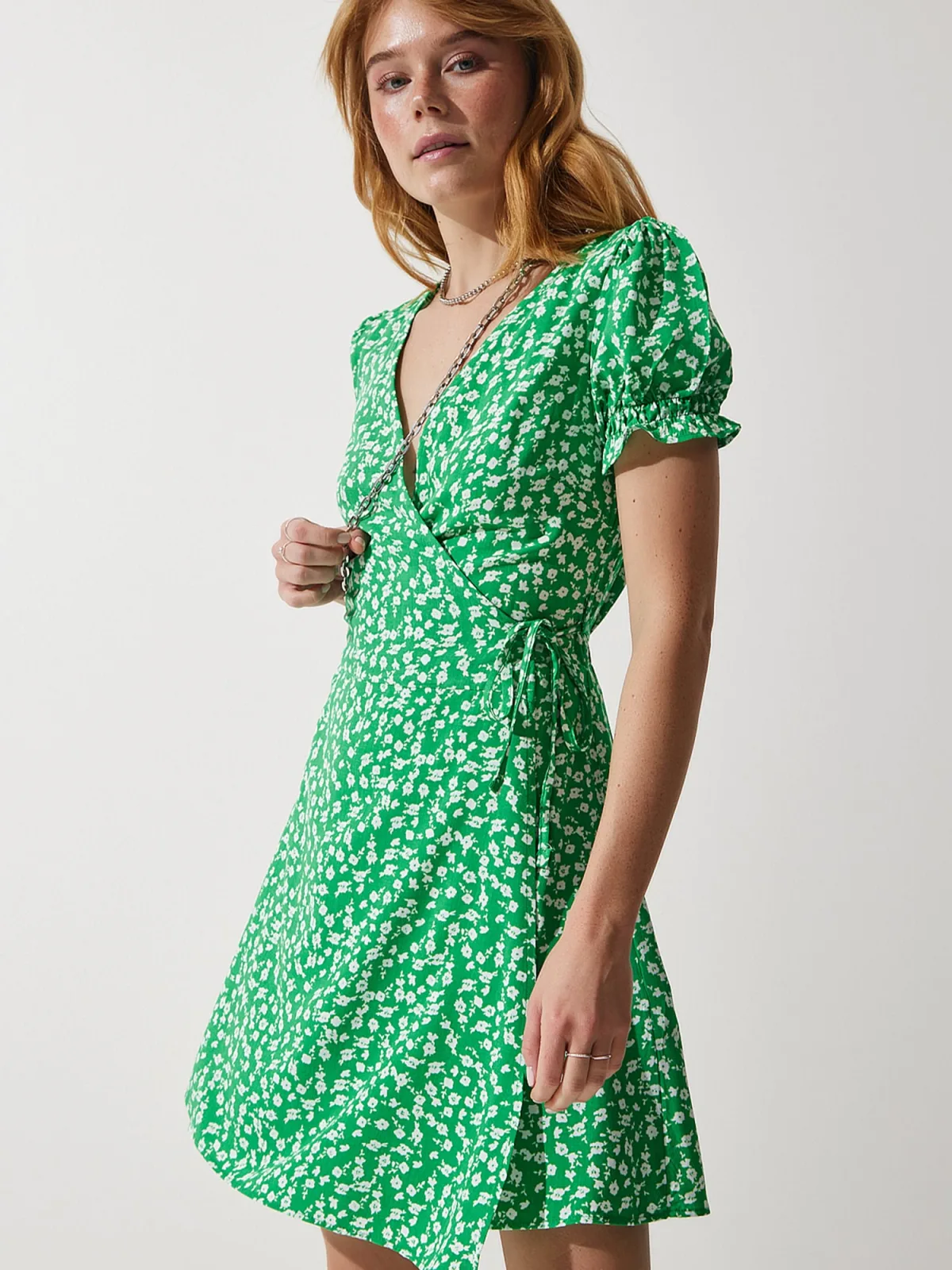 Design: Pofmouwen, Diepe snit/decolleté, Om te knopen/binden; Materiaal: Viscose; Halstype: Wikkeltop; Motief: Bloemenprint; Details: Ruches, Gedrapeerd, Wikkel design; Extra's: All-over patroon, Gladde stof; Lengte: Kort/mini; Snit: Getailleerd; Pasvorm: Slanke pasvorm; Armlengte: Kwartmouw
