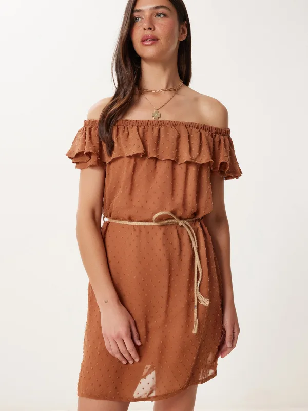 Design: Gevoerde zoom/rand, Strapless/off-shoulder, Tailleband, Om te knopen/binden; Materiaal: Chiffon; Halstype: Carmen hals; Motief: Effen; Details: Borduursels, Volant; Extra's: Op staal naden, Gladde stof, Met textuur; Lengte: Kort/mini; Snit: Getailleerd; Pasvorm: Normale pasvorm; Armlengte: Kwartmouw