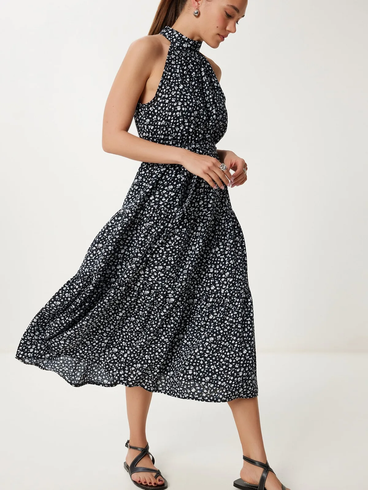 Design: Gevoerde zoom/rand, Keyholesluiting, Tailleband, Om te knopen/binden; Materiaal: Viscose; Halstype: Opstaande kraag; Motief: Bloemenprint; Soort bandjes: Haltermodel; Details: Volant, Gedrapeerd; Extra's: All-over patroon, Gladde stof; Lengte: 3/4 lengte; Snit: Getailleerd; Pasvorm: Losse pasvorm; Armlengte: Mouwloos