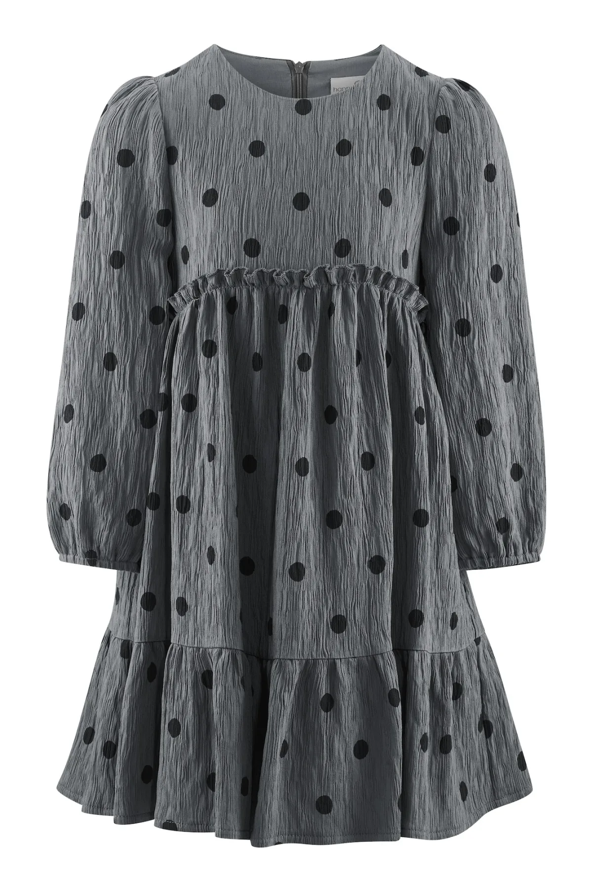 Design: Rug rits; Type sluiting: Ritssluiting; Materiaal: Mousseline; Halstype: Ronde hals; Motief: Gestippeld; Details: Ruches, Volant, Gedrapeerd; Extra's: All-over patroon; Lengte: Knielengte; Pasvorm: Normale pasvorm; Armlengte: Lange mouw