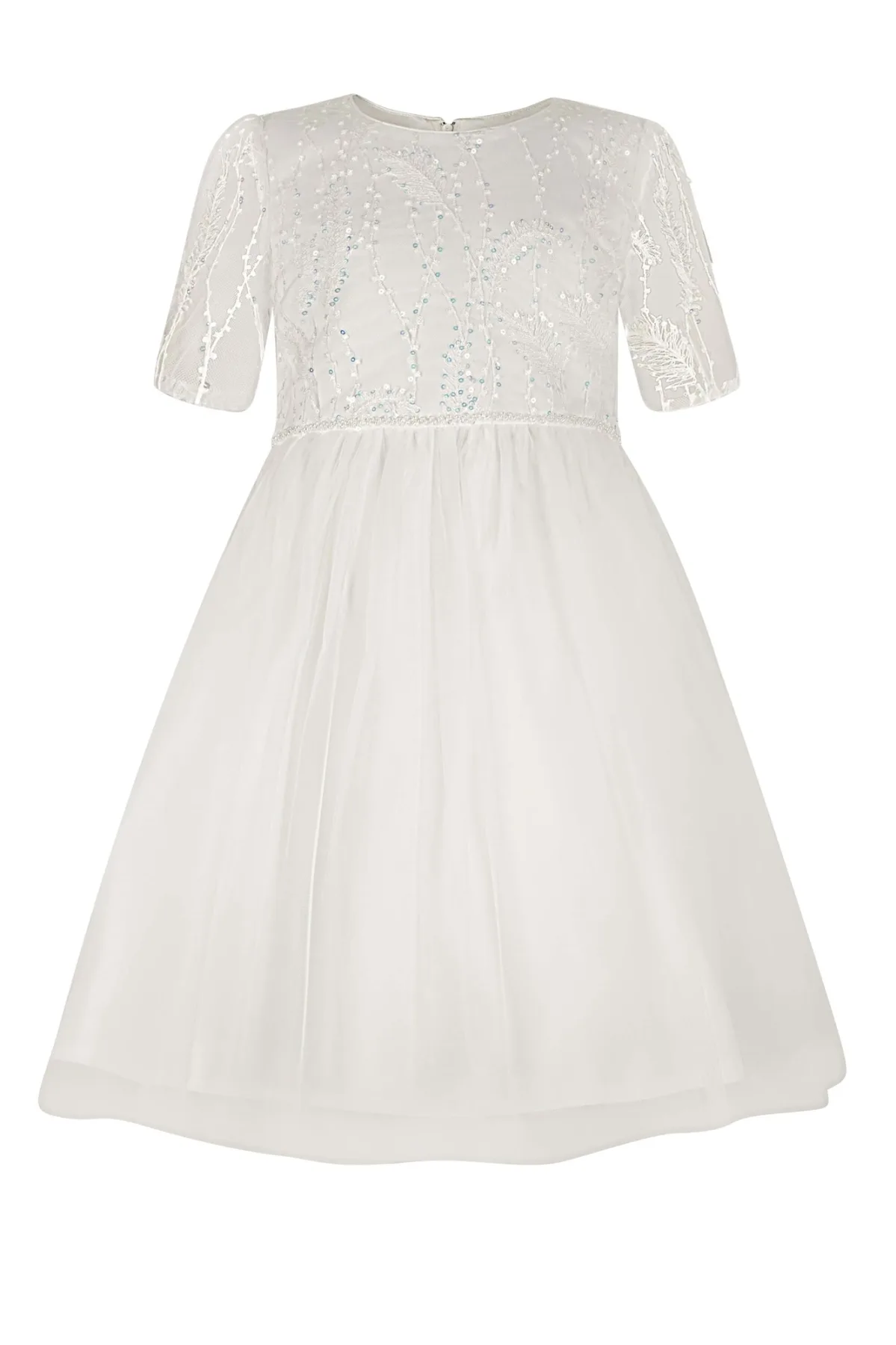 Design: Gevoerde zoom/rand; Halstype: Ronde hals; Motief: Effen; Details: Pailletten, Kant, Plooien, Parels; Extra's: Op staal naden; Lengte: Knielengte; Pasvorm: Normale pasvorm; Armlengte: Halve mouw