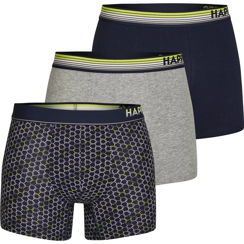 3 pack boxershorts (trunks) van het vrolijke merk Happy Shorts. Draag ze met een paar leuke sokken voor een perfecte match! Verpakking á 3 stuks, waarvan twee effen, één met Sports print.