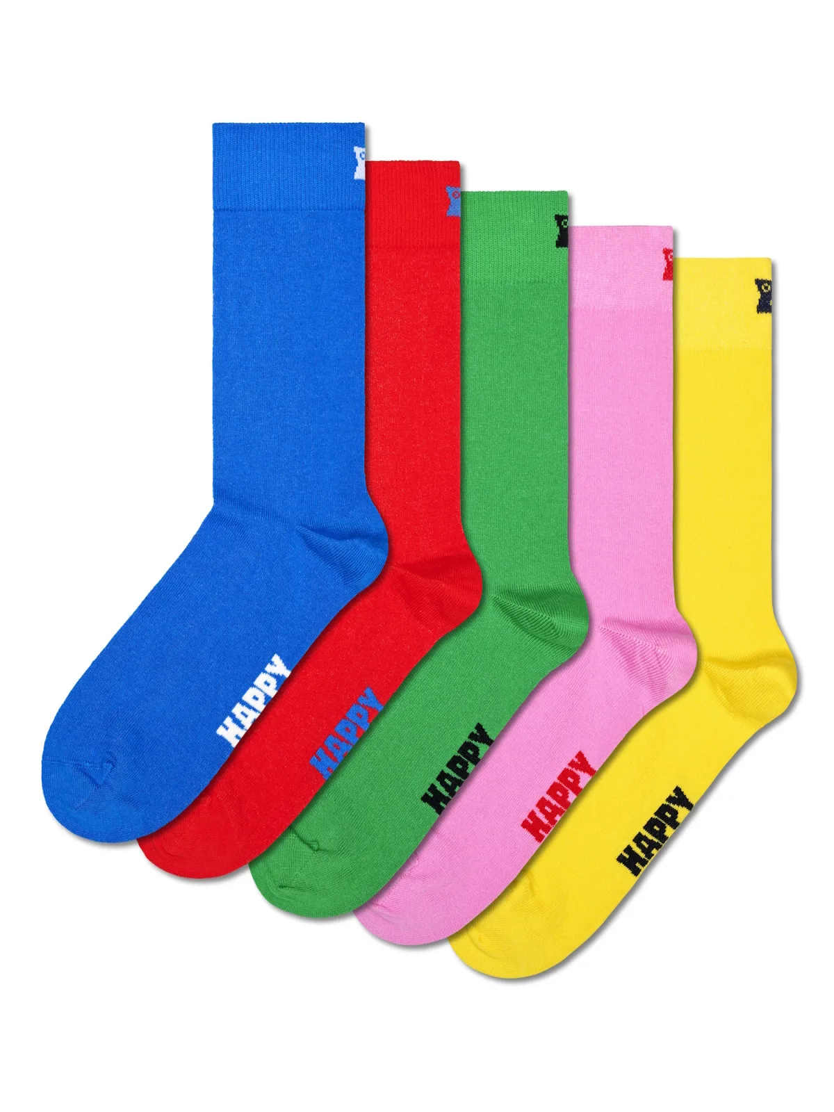 De Happy Socks effen sokken voor dames en heren zijn een kleurrijke keuze voor wie graag een statement maakt. Deze set van 5 paar sokken komt in opvallende kleuren zoals blauw, rood, groen, roze, en geel, en is voorzien van het herkenbare Happy Socks logo.