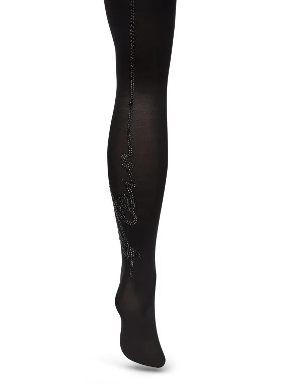 Zwarte nylon panty met de strass-steentjes van Plein Signature op de achterkant. Elastische tailleband.