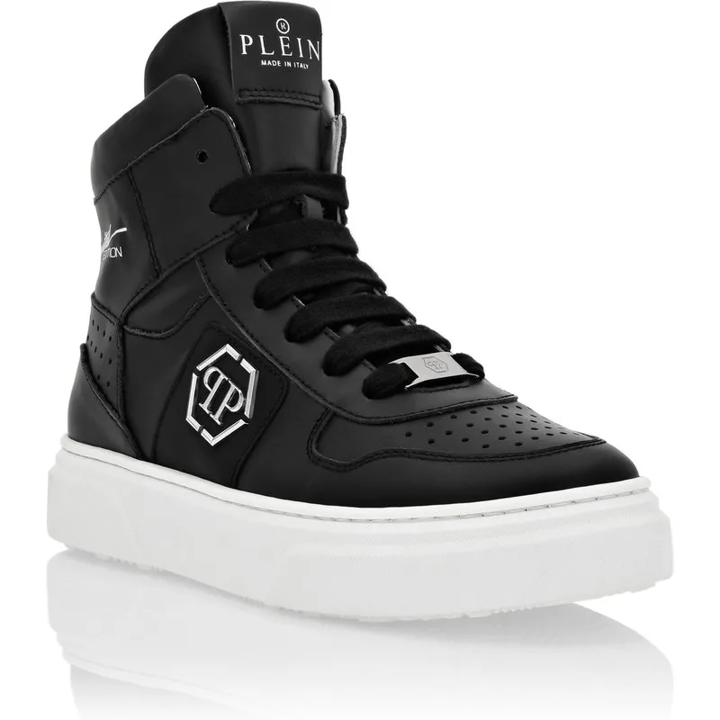 Queste sneakers mid-top portano un audace tocco streetwear ai guardaroba dei bambini mantenendo il comfort in prima linea. Progettati per essere abbinati senza sforzo a look casual e sportivi, sono un raffinato capo da indossare ogni giorno. Realizzato in pelle di vitello liscia per una finitura premium Mid-top silhouette che offre sia stile e supporto della caviglia Iconic hexagon logo patch aggiunge una firma Plein distintivo Fodera in pelle di vitello assicura comfort duraturo e traspirabilità La suola in gomma resistente offre stabilità e aderenza per le giornate attive