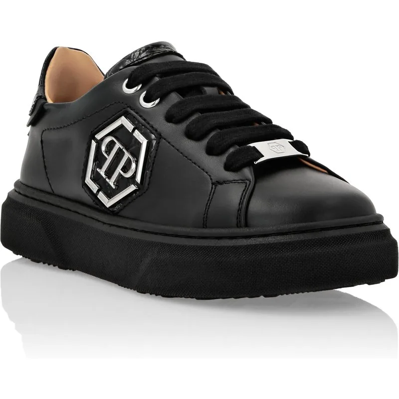 Deze lo-top sneakers zijn een slank nietje voor kinderkasten en brengen een veelzijdig vleugje luxe in casual outfits. Ideaal voor dagelijks gebruik, ze balanceren comfort met de gedurfde geest van Plein stijl. gladde kalfsleerconstructie voor een hoogwaardige afwerking lo-top silhouet voor eenvoudige, veelzijdige styling iconische Hexagon-logopatch benadrukt de kenmerkende rand van het merk kalfsleer voering biedt ademend comfort duurzame rubberen buitenzool zorgt voor grip en langdurige slijtage