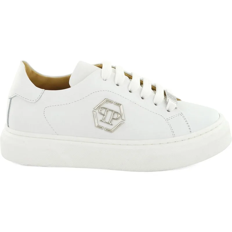 Deze lo-top sneakers van Plein Kids geven een luxueuze draai aan een casual essential. Ze zijn gemaakt van soepel kalfsleer en afgewerkt met kenmerkende metalen details. Ze combineren comfort met een gewaagde stijl voor elke dag. Kalfsleren bovenwerk voor duurzaamheid en een verfijnde look Kalfsleren voering voor comfort en ademend vermogen Handtekening metalen inzetstuk voor een kenmerkend Plein accent Lo-top model voor een veelzijdige, gemakkelijke styling Een hoogwaardige kindersneaker die alledaags comfort combineert met iconisch design