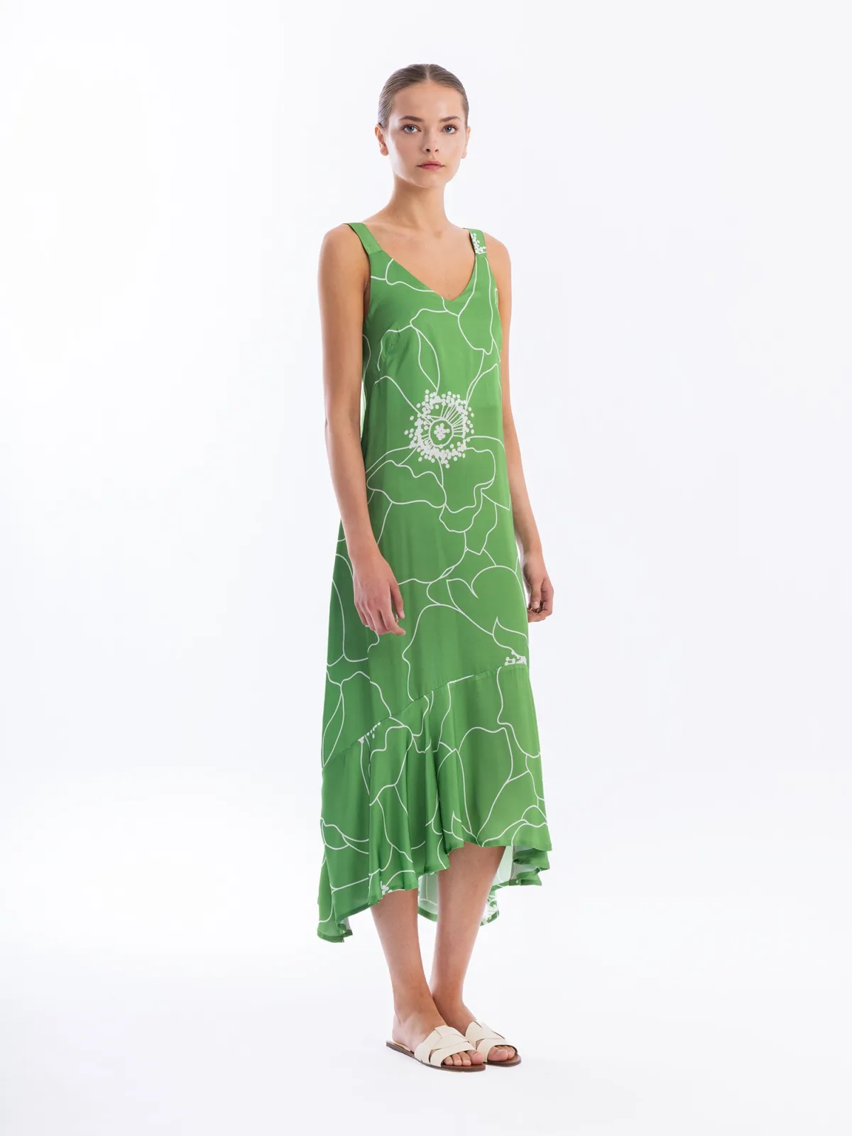 Materiaal: Satijn; Halstype: V-hals; Motief: Bloemenprint; Soort bandjes: Normale bandjes; Details: Volant; Lengte: Knielengte; Pasvorm: Normale pasvorm; Armlengte: Mouwloos