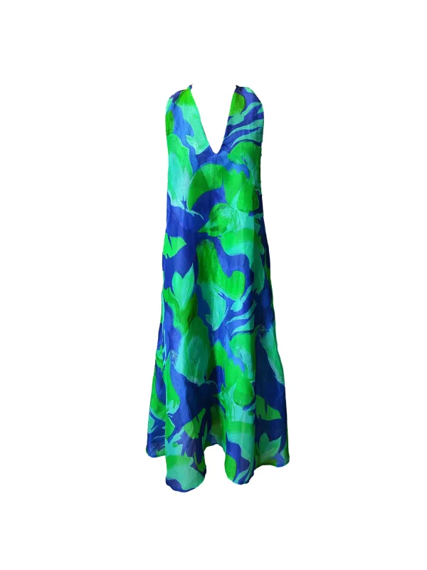 Materiaal: Linnen; Halstype: V-hals; Motief: Bloemenprint; Soort bandjes: Haltermodel; Lengte: Knielengte; Pasvorm: Normale pasvorm; Armlengte: Mouwloos