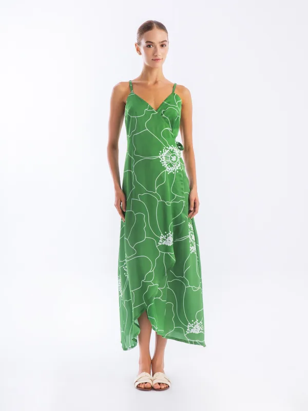 Materiaal: Satijn; Halstype: V-hals; Motief: Bloemenprint; Soort bandjes: Spaghettibandjes; Details: Wikkel design; Lengte: 3/4 lengte; Pasvorm: Aansluitende pasvorm; Armlengte: Mouwloos