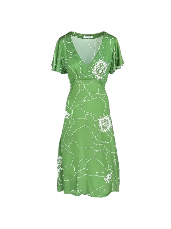 Materiaal: Satijn; Halstype: V-hals; Motief: Bloemenprint; Soort bandjes: Normale bandjes; Details: Ruches; Lengte: Knielengte; Pasvorm: Aansluitende pasvorm; Armlengte: Kwartmouw