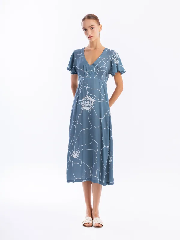 Materiaal: Satijn; Halstype: V-hals; Motief: Bloemenprint; Soort bandjes: Normale bandjes; Details: Ruches; Lengte: Knielengte; Pasvorm: Aansluitende pasvorm; Armlengte: Kwartmouw