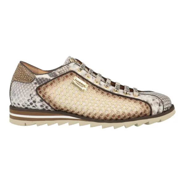 Deze 5339 sneaker uit de Harris collectie voor heren heeft een upper van premium leer met een pitonprint wat deze sneaker een exotische uitstraling geeft. De jutevlecht aan de zijkant voegt een uniek natuurlijk element toe. De markante zool biedt niet alleen een eigentijdse look, maar zorgt ook voor uitstekende grip en duurzaamheid. De handgeschilderde kleurovergangen van het leer versterken het ambachtelijke karakter, terwijl subtiele gestikte details en contrasterende accenten het exclusieve ontwerp compleet maken. Naast zijn visuele aantrekkingskracht staat deze schoen garant voor optimaal draagcomfort. De leren uitneembare binnenzool en de stevige tandzool zorgen voor een perfecte balans tussen stijl, stabiliteit en functionaliteit.Ideaal voor heren die een statement willen maken, is deze Harris-schoen geschikt voor zowel formele als smart-casual gelegenheden. Voeg een vleugje luxe en moderniteit toe aan uw garderobe met deze onderscheidende Harris 5339 herenschoen met tandzool.