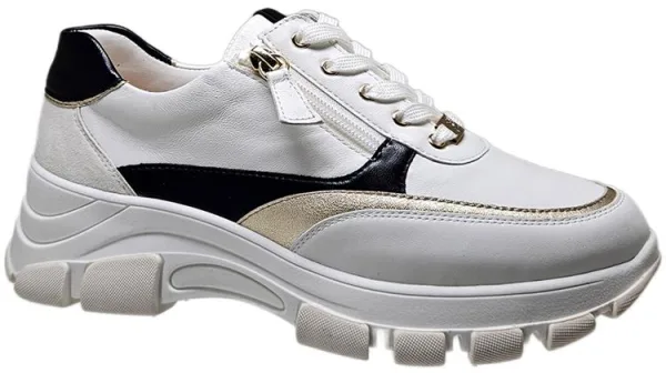 Hassia 1-301450-0201 – Luxe Chunky Sneaker in Wit, Zwart & GoudMaak een stijlvol statement met deze eyecatcher van Hassia. Deze sneaker combineert een sportief, robuust silhouet met een zeer verfijnde afwerking. Het samenspel van fris wit leer, diepzwarte accenten en luxe goudkleurige details geeft deze schoen een exclusieve, modieuze uitstraling die elke outfit naar een hoger niveau tilt.Ultiem Comfort & GebruiksgemakHassia staat wereldwijd bekend om haar "Premium Comfort" pasvorm, en dat voelt u direct. De opvallende chunky zool is niet alleen een mode-item, maar biedt ook uitstekende demping en stabiliteit. Dankzij de handige ritssluiting naast de veters stapt u moeiteloos in en uit, zonder telkens de veters te hoeven strikken.Waarom deze Hassia sneaker niet in uw kast mag ontbreken:Hoogwaardige Materialen: Vervaardigd uit eersteklas leer met subtiele suède overlays en metallic goud-accenten voor een luxe 'finish'.Optimaal Voetklimaat: Volledig ledergevoerd, wat zorgt voor een ademend vermogen en een zacht gevoel rondom de voet.Uitneembaar Voetbed: De schoen is voorzien van een anatomisch gevormd, lederen voetbed. Ideaal voor dames die gebruikmaken van eigen steunzolen.Trendsetters-zool: De grove, witte lichtgewicht zool geeft de sneaker een moderne runner-look en zorgt voor een heerlijke afwikkeling tijdens het lopen.Perfecte Pasvorm: Ontworpen met oog voor de vrouwelijke voet, gecombineerd met de kwaliteit waar dit Oostenrijkse topmerk om bekendstaat.Specificaties op een rij:Kleur: Wit / Zwart / Goud (0201)Materiaal: Luxe leer en suèdeVoering: Hoogwaardig leerSluiting: Veter + RitsZool: Lichtgewicht rubber (Chunky profile)Voetbed: UitneembaarStylingtip: Draag deze sneakers onder een verkorte jeans of een wijde pantalon voor een sportieve look. Durft u meer? Combineer ze dan met een vrouwelijke rok of midi-jurk voor een gedurfd contrast tussen stoer en elegant.