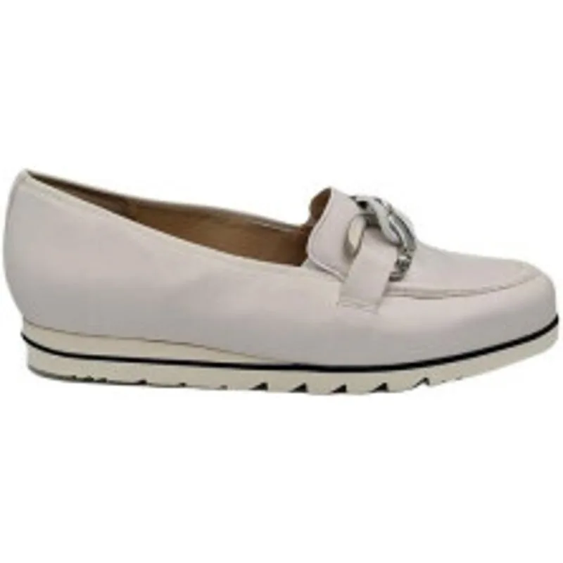 HASSIA 01549 loafers in de kleur wit (milk). Deze loafers zijn gemaakt van zacht leer en heeft op de wreef een wit met zilverkleurige buggle. De binnenkant is van leer en heeft een uitneembaar voetbed. De witte rubberen zoolrand heeft een zwart rand en heeft een gekartelde loopzool voor gripvaste ondergrond.