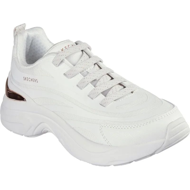 Geef je look een boost met de Street Hazel van Skechers. Deze modieuze sneaker heeft een bovenwerk van hotmelt-synthetisch materiaal en mesh met metallic hielkapdetails, goudkleurige stretchveters en een dempende Memory Foam binnenzool.