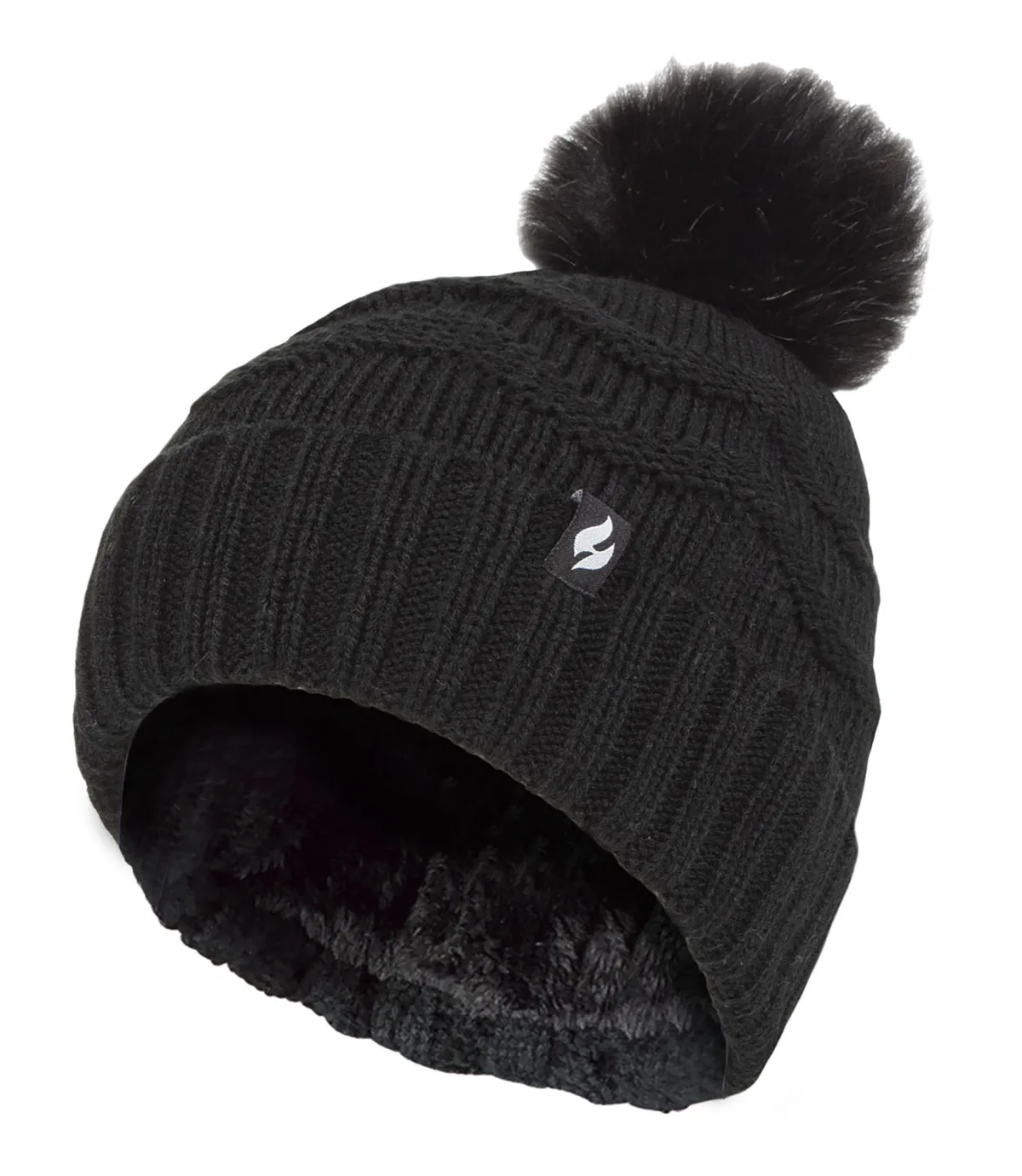 Heat Holders Dames Winter Bont Pom Pom Beanie Muts – Zwart