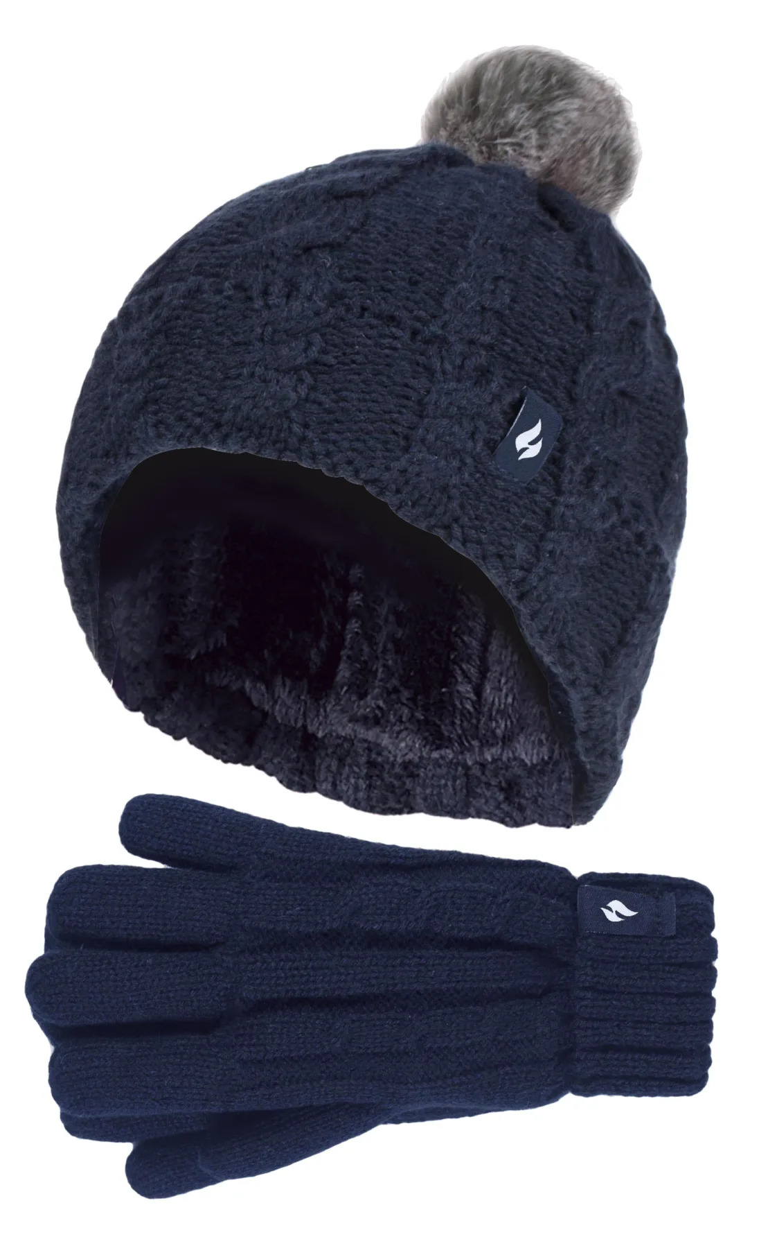 Heat Holders Meisjes Cable Bobble Muts En Handschoenen Set – Marine Prijzen