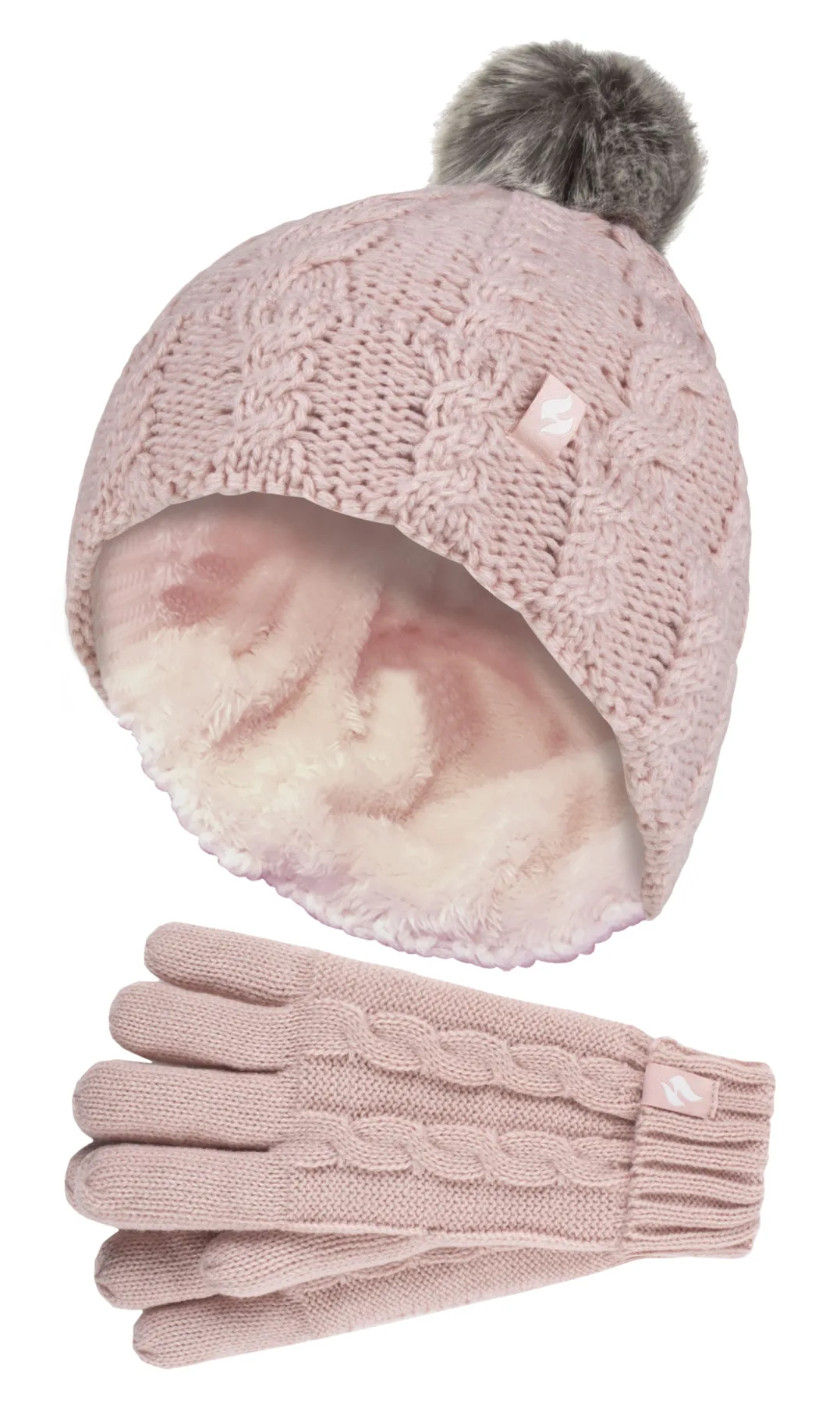 Heat Holders Meisjes Cable Bobble Muts En Handschoenen Set – Schemerig Roze