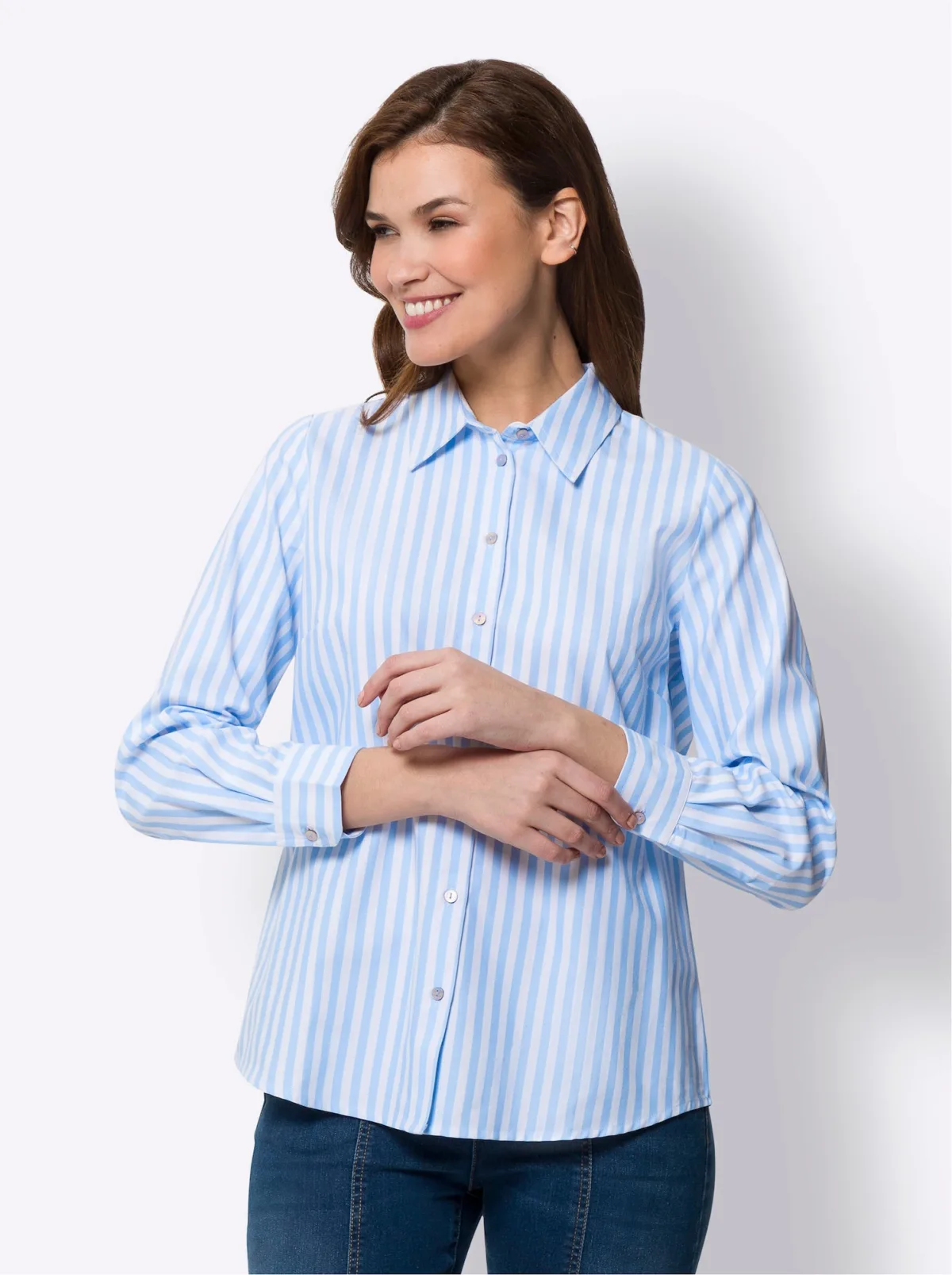 Blouse type: Klassieke blouse; Design: 1-knoops manchetten, Rugplooi; Type sluiting: Knoopsluiting; Materiaal: Katoen; Motief: Gestreept; Kraag: Kentkraag; Details: Plooien; Extra's: All-over patroon; Pasvorm: Normale pasvorm; Armlengte: Lange mouw; Lengte: Normale lengte