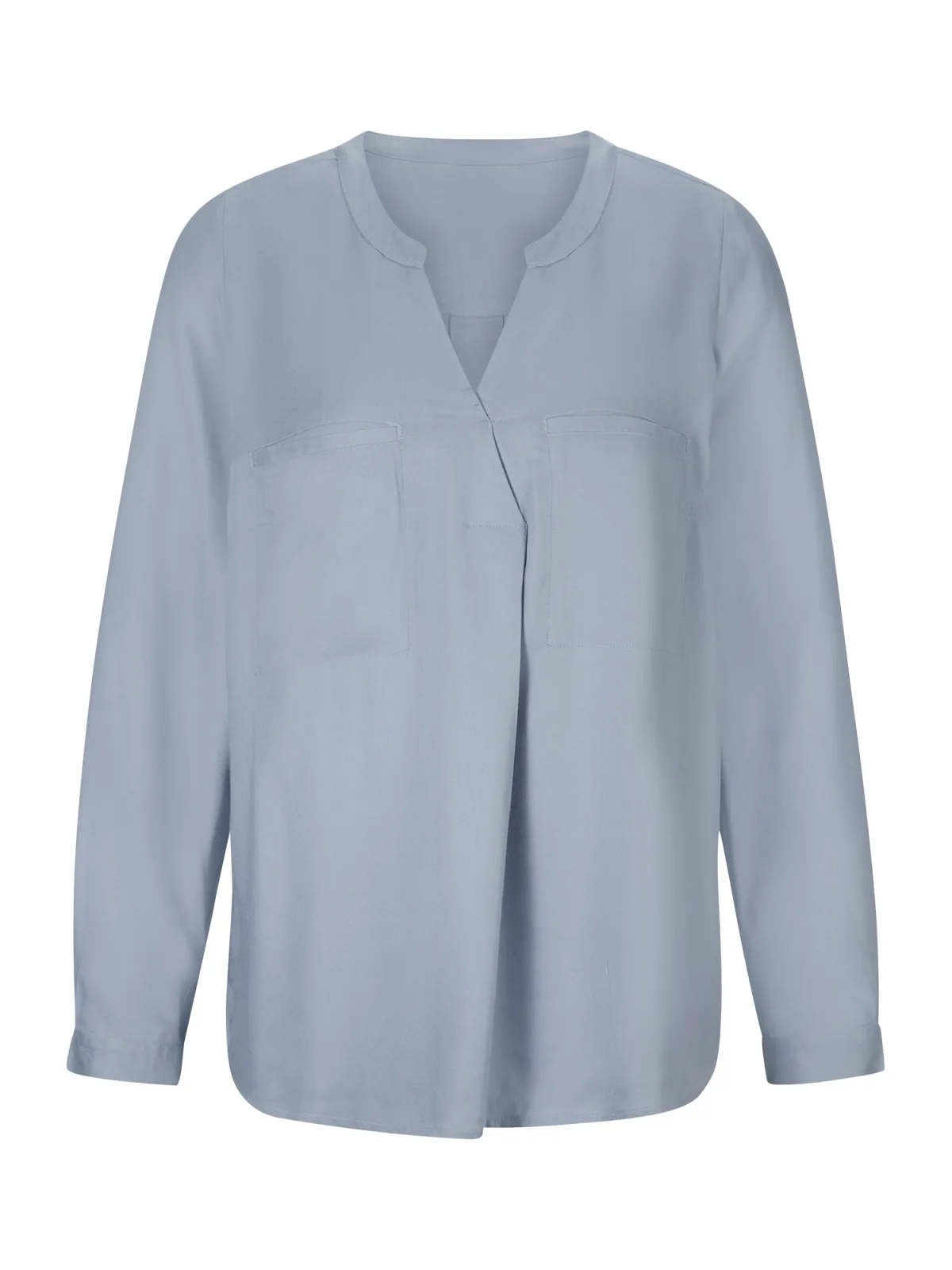 Blouse type: Blouseshirt; Design: 1-knoops manchetten, Rugplooi; Materiaal: Viscose; Motief: Effen; Kraag: Tuniek kraag; Details: Plooien; Extra's: Lichte stof; Pasvorm: Losse pasvorm; Armlengte: Lange mouw; Lengte: Normale lengte