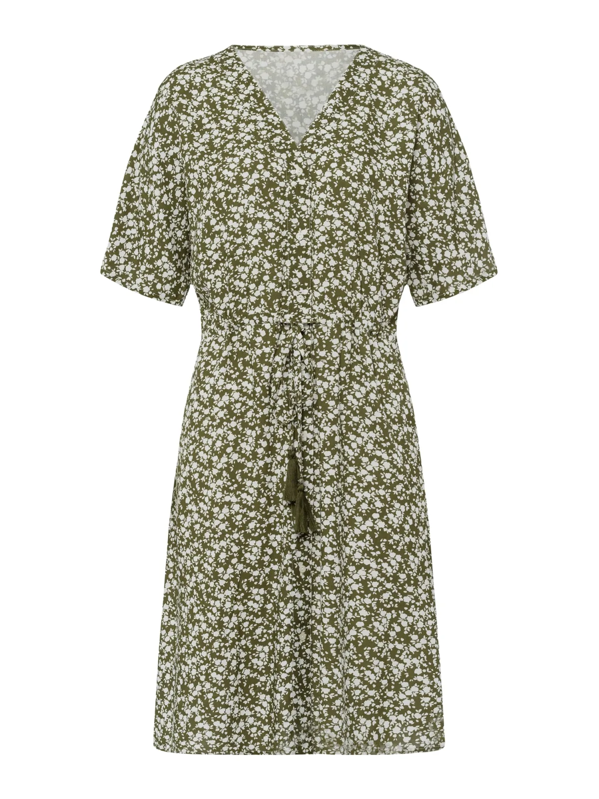 Design: Tailleriem; Type sluiting: Knoopsluiting; Materiaal: Viscose; Halstype: V-hals; Motief: Bloemenprint; Kraag: Zonder kraag; Details: Franjes; Extra's: All-over patroon, Gladde stof; Lengte: Knielengte; Snit: Getailleerd; Pasvorm: Normale pasvorm; Armlengte: Halve mouw