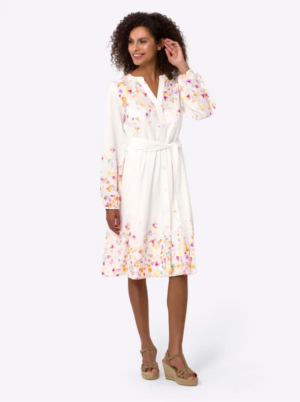 Design: Elastische taille/zoom, Om te knopen/binden, Tailleriem; Type sluiting: Knoopsluiting; Materiaal: Katoen; Halstype: Uitgesneden hals; Motief: Bloemenprint; Extra's: All-over patroon; Lengte: Knielengte; Pasvorm: Normale pasvorm; Armlengte: Lange mouw